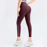 High waist purple yoga pants with cross-hollow design and breathable fabric for comfort and style. High waist purple yoga pants with elastic cuffs and a fitted style, ideal for workouts and casual wear.